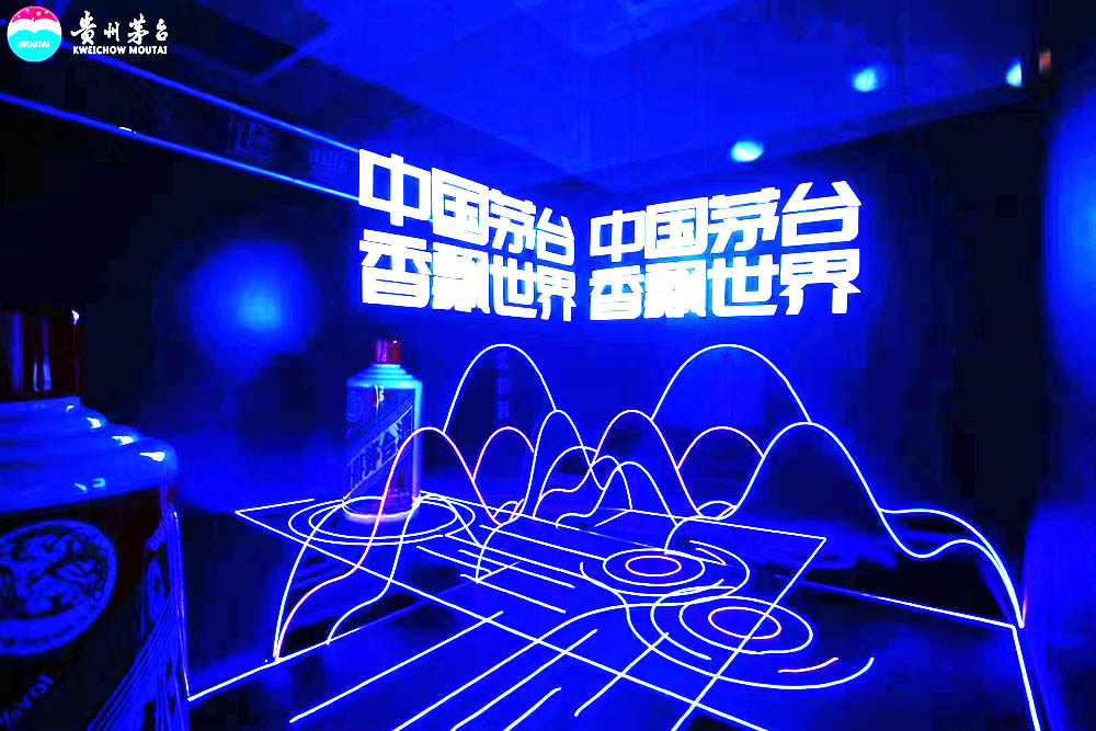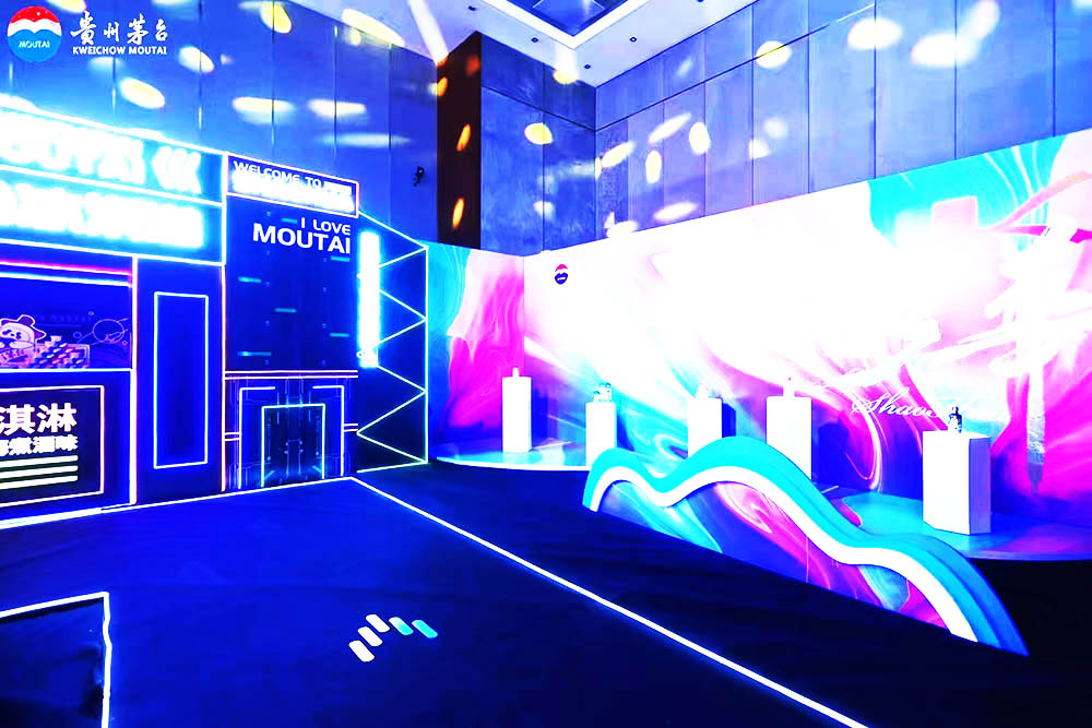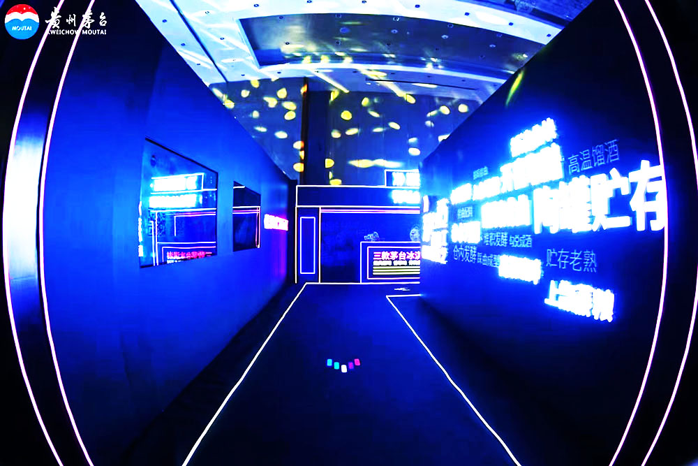 入口處,賽博朋克的led燈光與打卡區的交互體驗結合,打造了一個全新的沉浸式穿梭場景,它似是通向茅臺美好未來的隧道,從這里進入,迎接一個屬于茅臺的“美”時代。這種將茅臺文化與現代化科技相融合的手法為到場的來賓們逐步揭開了茅臺的神秘面紗。